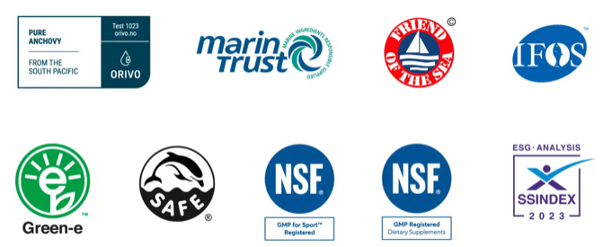 - Óleo de peixe premium altamente concentrado (Goldenomega®) de pequenos peixes de águas frias provenientes de águas não poluídas ao largo da costa do Peru e do Chile – certificado Friend of the Sea®