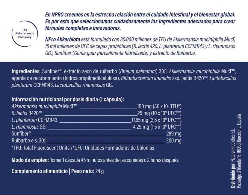 O Akkerbiota da NPRO contém 30 mil milhões de TFUs * de Akkermansia MucT™, 3 estirpes probióticas com um total de 15 mil milhões de UFC** (B. lactis B420™, L. plantarum CCFM1143 e L. rhamnosus GG), e ingredientes com efeito prebiótico – Sunfiber® (goma guar parcialmente hidrolisada) e extrato seco de ruibarbo. A Akkermansia muciniphila contribui para o equilíbrio da mucosa e da microbiota intestinal.