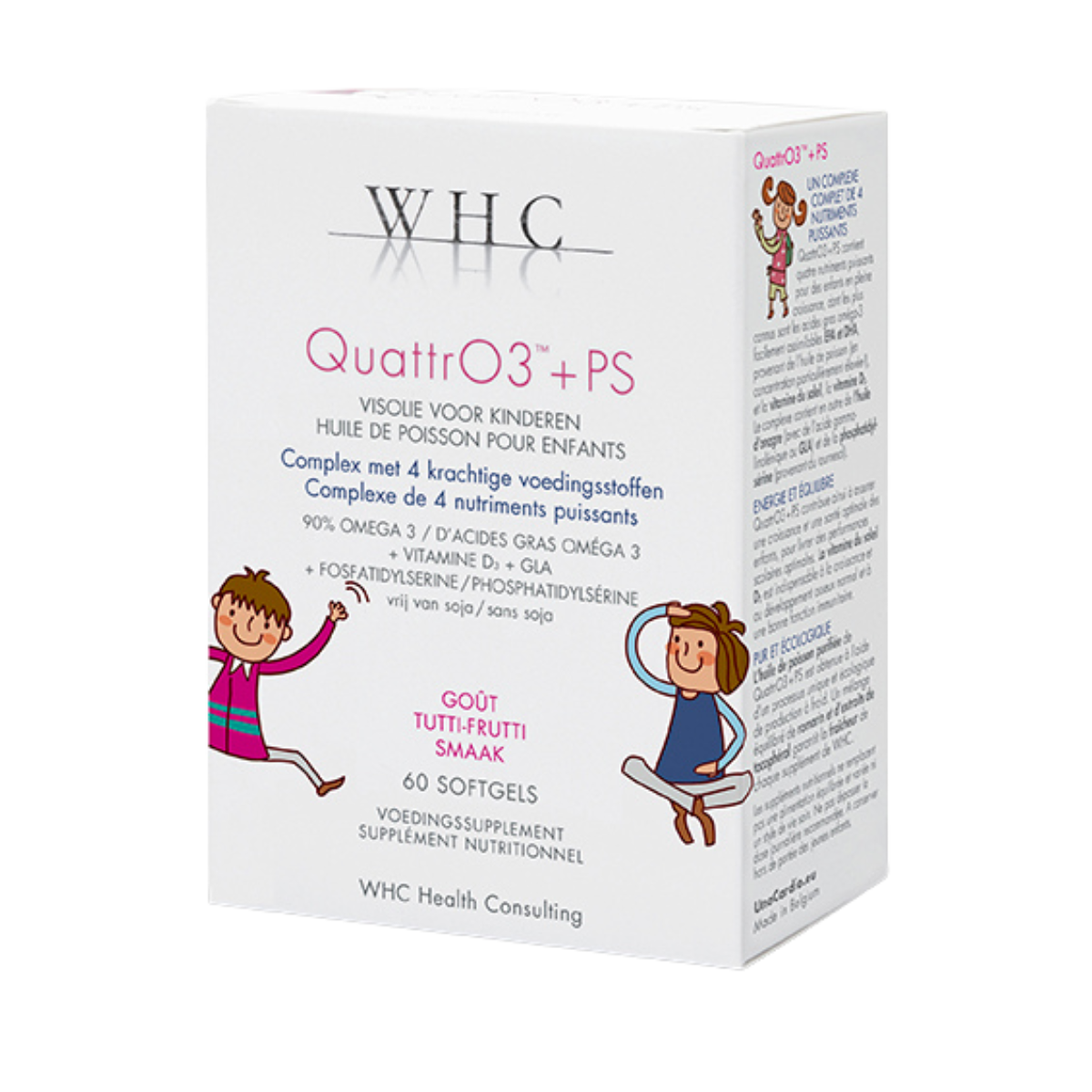 O QuattrO3 + PS da WHC Labs foi formulado para apoiar o desenvolvimento das crianças dos 3 aos 14 anos. Oferece a máxima qualidade e segurança, sendo das poucas marcas com certificação IFOS 5*. Como tal, cada 2 cápsulas fornecem:
