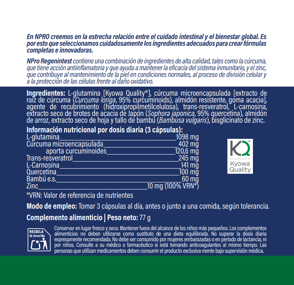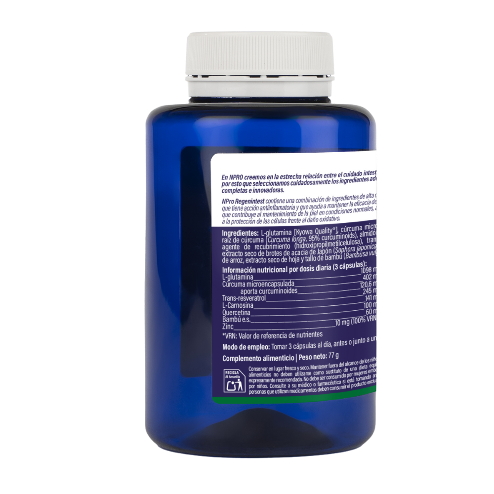 Npro REGENintest regenerates the intestinal epithelium and mucosa. Thanks to its formula based on amino acids, anti-inflammatory plants, and antioxidants, it protects the intestinal barrier. The synergy of its ingredients reinforces the natural defense mechanisms against mucosal degradation.