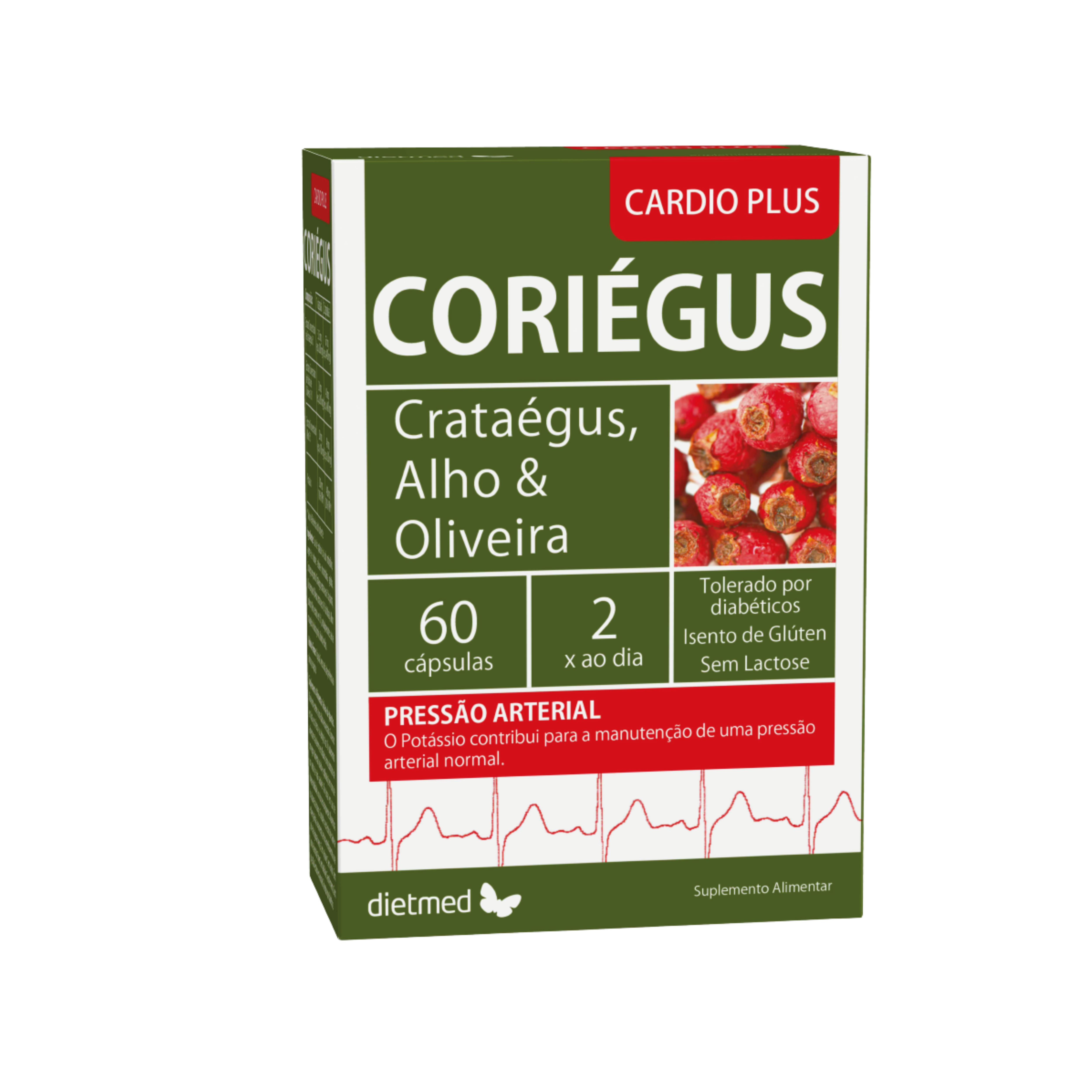 O Coriegus Plus da Dietmed é um suplemento alimentar constituído por elementos utilizados pelo homem há séculos, quer na sua alimentação, quer na melhoria das suas condições de saúde. Os seus elementos são tradicionalmente utilizados como redutores de alguns factores de risco de doenças cardiovasculares, nomeadamente na hipertensão, aterosclerose e níveis elevados de colesterol. É também útil como tónico cardiovascular e anti-agregante plaquetar. Possui ainda uma acção antioxidante, ajudando o organismo a proteger-se da acção nefasta dos radicais livres.